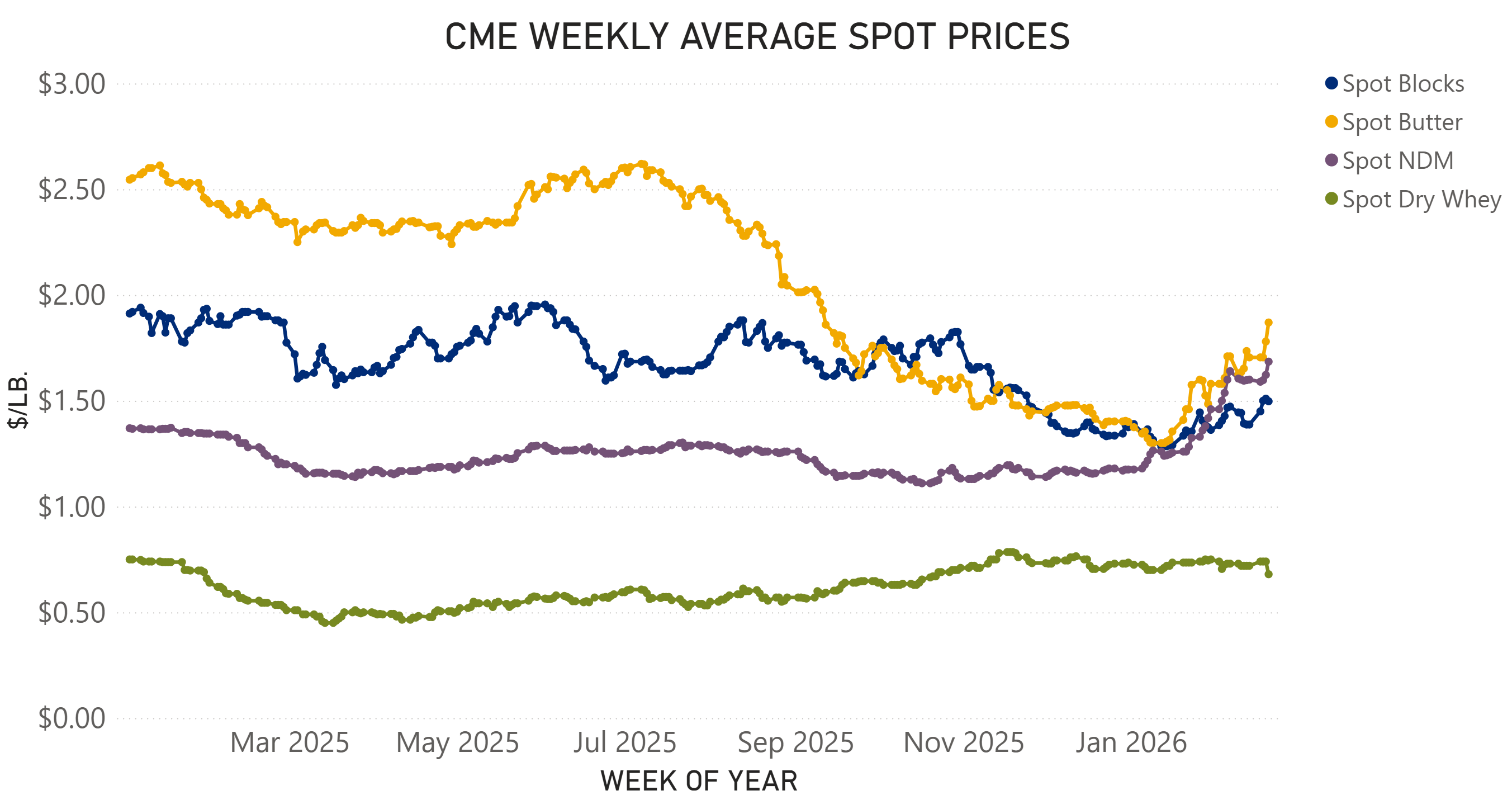 Spot markets strengthened modestly in mid-February, before slightly easing again at the start of this week, reflecting reports of tightening butterfat availability alongside reactions to USDA's announcement of Section 32 purchases. Through AMS, the USDA released plans to purchase $148 million in dairy products, including $75 million in butter, which could provide a meaningful near-term demand boost. Further details of these purchases have not been released.